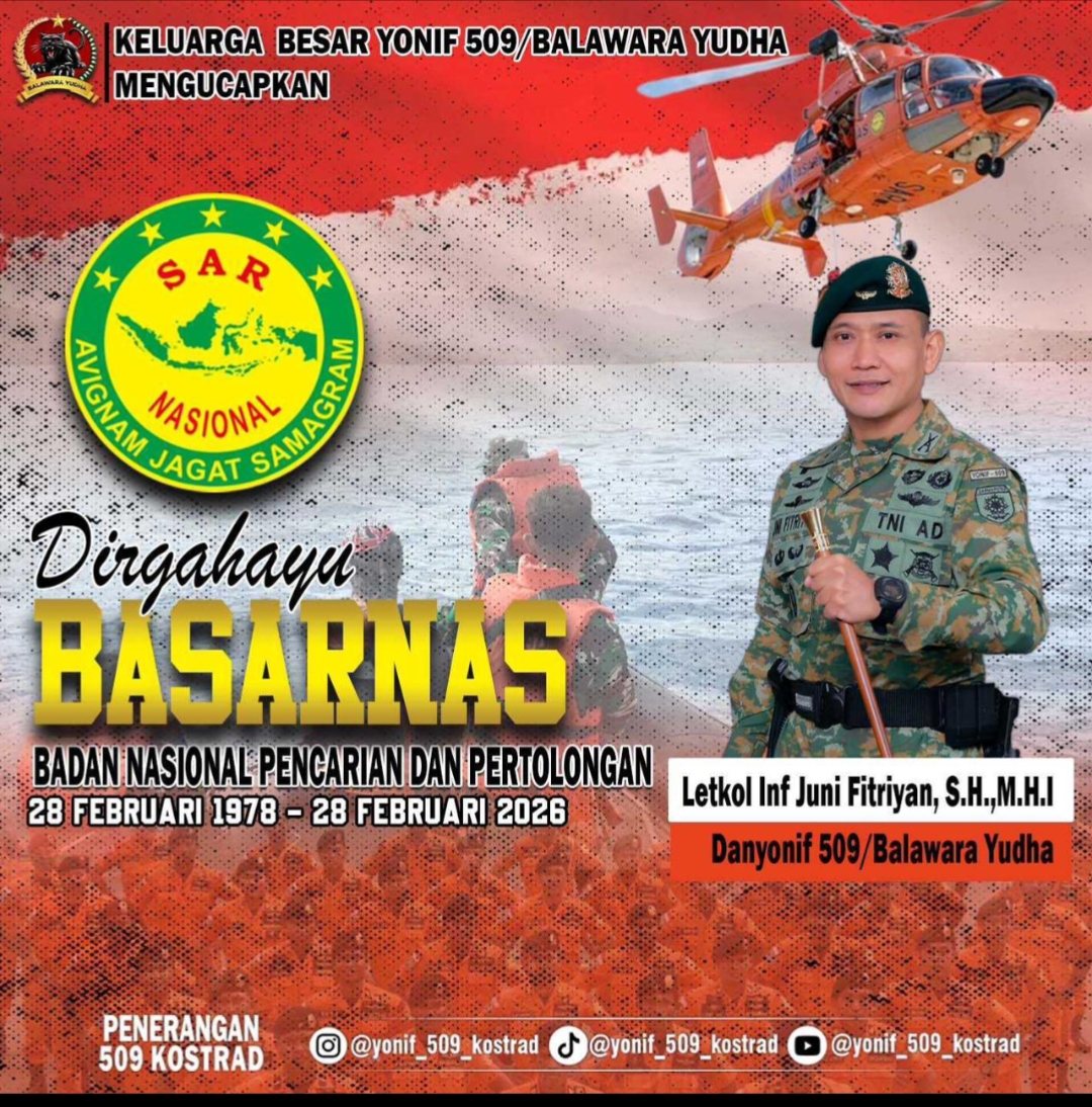 Beritainfonusantara.com Jember – Keluarga Besar Batalyon Infanteri (Yonif) 509/Balawara Yudha menyampaikan ucapan Dirgahayu kepada Badan Nasional Pencarian dan Pertolongan (Basarnas) yang ke-48 pada 28 Februari 2026. Ucapan tersebut disampaikan sebagai…