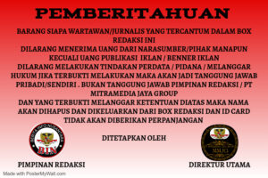 kepada semuah anggota jurnalis/wartawan,https://beritainfonusantara.com (BIN) ditegaskan dilarang keras melakukan tindakan perdata/pidana tetap mematuhi kode etik jurnalis,dilarang menerima uang ,pemberitaan sesuai narasumber tanpa pemotongan, jika melangar maka akan jadi tangung jawab sendiri/wartawan itu sendiri , bukan tangung jawab redaksi/PT MITRAMEDIA JAYA GROUP.(dan akan dikeluarkan dari redaksi)