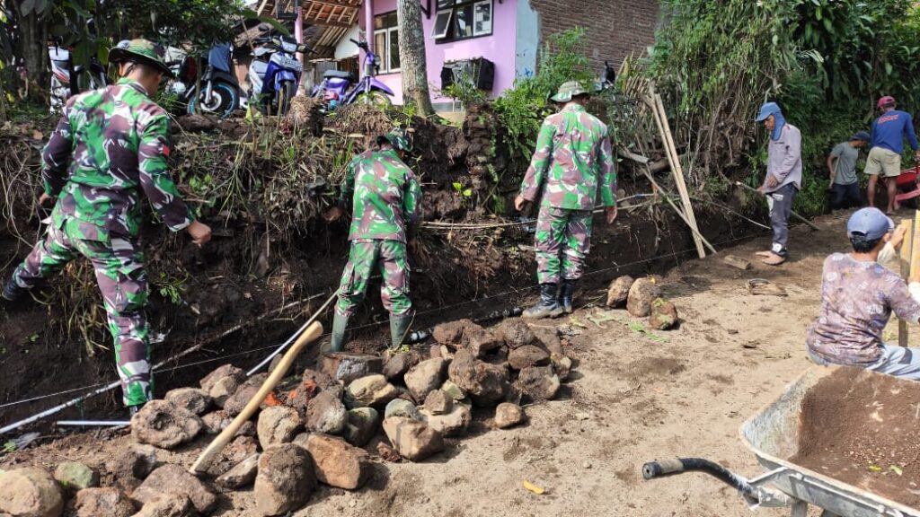 Bondowoso – Di pagi yang cerah ini Anggota Satgas TNI Manunggal Membangun Desa (TMMD) Reguler Ke-123, Kodim 0822 Bondowoso, personel yang tergabung dalam Satgas TMMD bertempat di Dusun Krajan Rt. 02 Rw. 01 Desa Trotosari, Kecamatan Sukosari, Kabupaten Bondowoso yang kebut pembuatan plengsengan jalan, Minggu (9/3/2025).