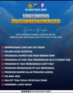 *Jember –* Satuan Lalu Lintas (Satlantas) Polres Jember melaksanakan *Operasi Keselamatan Semeru 2026* sebagai upaya menciptakan kondisi keamanan, keselamatan, ketertiban, dan kelancaran lalu lintas (Kamseltibcarlantas) menjelang Hari Raya Idulfitri 1447 H.
