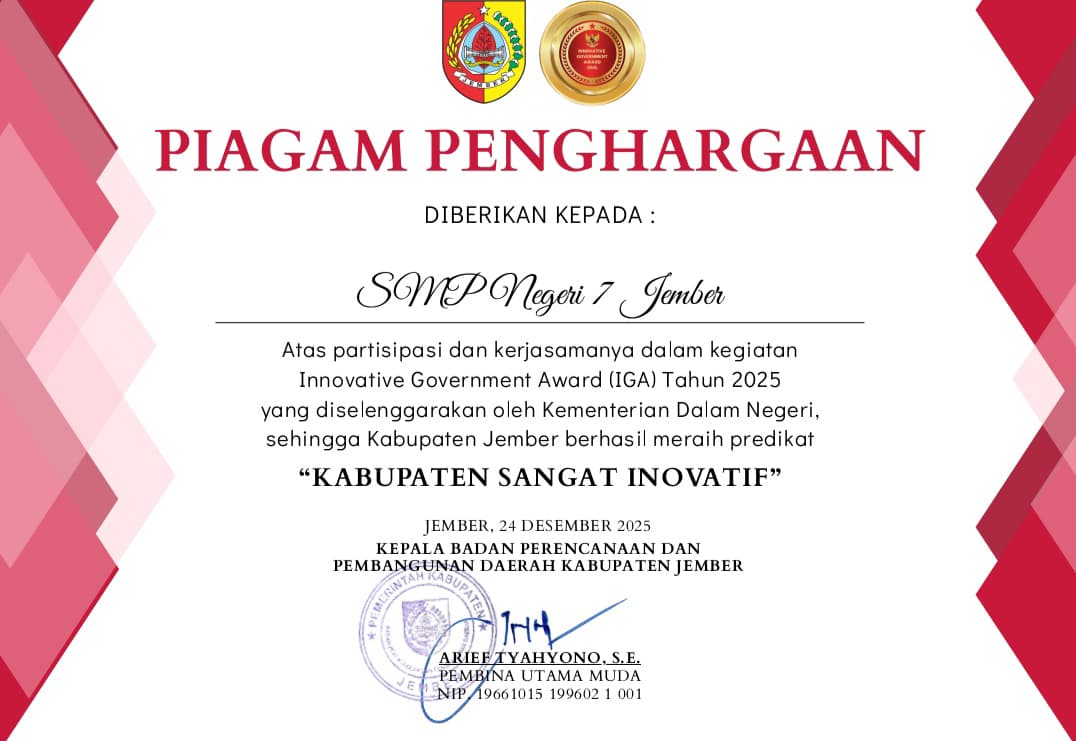 Piagam penghargaan tersebut diserahkan oleh **Badan Perencanaan dan Pembangunan Daerah (Bappeda) Kabupaten Jember** pada 24 Desember 2025. Prestasi ini diharapkan menjadi motivasi bagi SMP Negeri 7 Jember untuk terus meningkatkan mutu pendidikan dan berkontribusi nyata bagi kemajuan daerah.