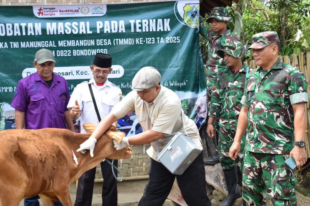 Bondowoso, 5 Maret 2025 – Dalam upaya meningkatkan produktivitas peternakan warga, TMMD ke-123 Kodim 0822 Bondowoso menggelar layanan kesehatan ternak di Desa Gunosari.